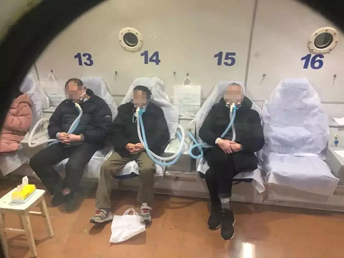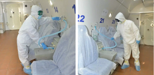 2月17日起,医院对部分需要的新冠肺炎普通型患者进行了高压氧治疗。新冠肺炎患者入舱前,医护人员对患者进行各项注意事项的宣教,入舱后操作人员通过对讲系统再次对患者进行指导,确保患者佩戴口罩和吸氧面罩时做到无缝连接;在氧舱中,治疗患者隔位就坐;对于不使用的吸氧口、排氧口使用乳胶手套绑扎,防止管道污染;每人配备纸巾及垃圾袋,供咳嗽时使用;患者出舱后,对高压氧舱及所有相关物品进行严格终末消毒处理。