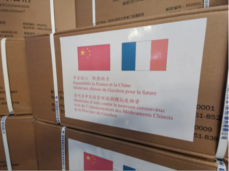 本批捐赠给法国东部大区的抗“疫”物资由贵州省中医药管理局发起筹集,由贵州中医药大学专家团队研发、经贵州省药品监督管理局备案,国药集团同济堂制药及部分民族医药企业生产。