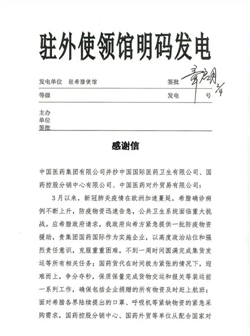 "为感谢国药集团、国药国际在此次中国政府对希腊紧急援助防疫物资工作中的大力协助,中国驻希腊大使馆专程发来感谢信。”