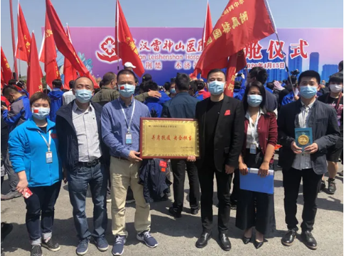 4月15日上午,在雷神山医院“休舱”仪式上,国药集团国控湖北公司代表领取了院方赠予的“并肩抗疫,央企担当”纪念牌。