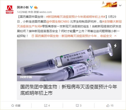 5月30日凌晨,据国务院国资委官方微博国资小新,??5月29日,国资小新走进国药集团中国生物北京生物制品研究所在全球最大新冠灭活疫苗生产车间零距离感受一支新冠灭活疫苗的诞生!当前新冠疫苗的研发进展如何?接种新冠疫苗是否安全?何时才能量产上市?带着这些问题跟随小新一起探秘!