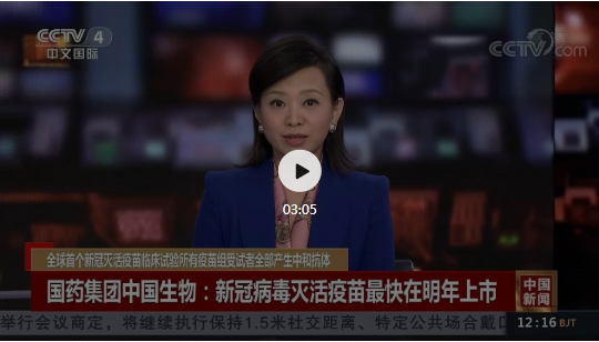 6月18日,CCTV-4中文国际频道中国新闻播出了全球首个新冠灭活疫苗临床试验所有疫苗组受试者全部产生中和抗体的报道,国药集团中国生物的新冠病毒灭活疫苗最快在明年上市。