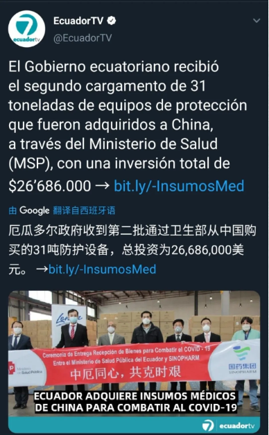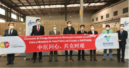 当日下午,中厄双方在基多机场举行了国药国际供应抗疫物资交接仪式,厄经济财政部长马丁内斯、厄卫生部副部长索洛萨诺和中国驻厄大使陈国友、商务参赞陈峰等出席交接仪式。