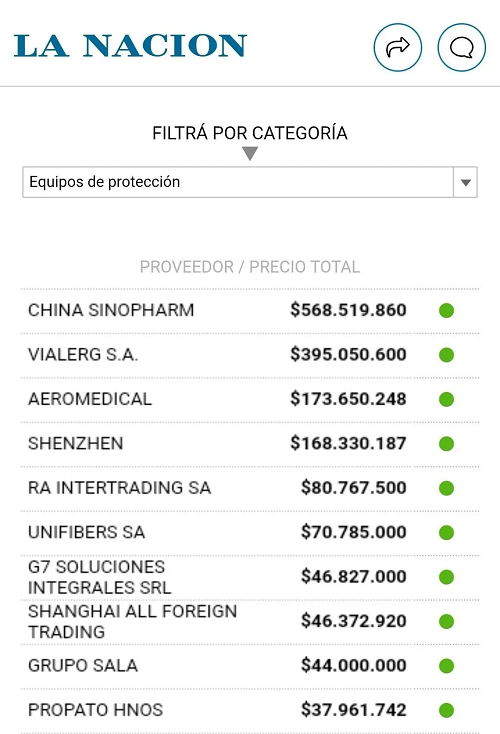 近日,阿根廷《国家报》发布了一份向阿根廷政府提供抗击新冠疫情医疗产品的供应商名单,国药集团国药国际在个人防护用品类产品全球供应商中位列榜首。此前,国药国际已向阿根廷供应了300万个医用外科口罩、30万件医用一次性防护服等抗疫物资。截至7月4日,14个批次的物资已分别搭乘专机全部运抵阿根廷首都布宜诺斯艾利斯。