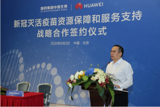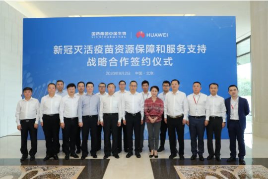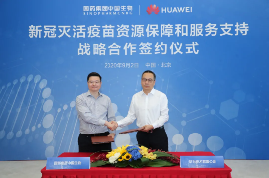 9月2日,国药集团中国生物与华为技术有限公司在京签署新冠灭活疫苗资源保障和服务支持战略合作协议,双方将携手抗击新冠疫情、保障员工健康,同时在疾病预防、生物技术应用创新等方面展开跨界合作。