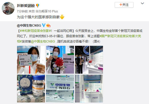 国务院原副总理马凯视察了国药集团中国生物抗疫成果展台,工业和信息化部部长肖亚庆陪同参观。国药集团董事长刘敬桢向马凯介绍了中国生物在新冠疫情防控的诊断、治疗、预防等方面作出的突出贡献。目前,中国生物研发的两个新冠灭活疫苗正在阿联酋、巴林、秘鲁、摩洛哥、阿根廷等10个国家开展Ⅲ期临床试验,各方面进展全面领跑全球。北京市副市长卢彦莅临中国生物展台参观,并听取了有关工作人员的介绍。