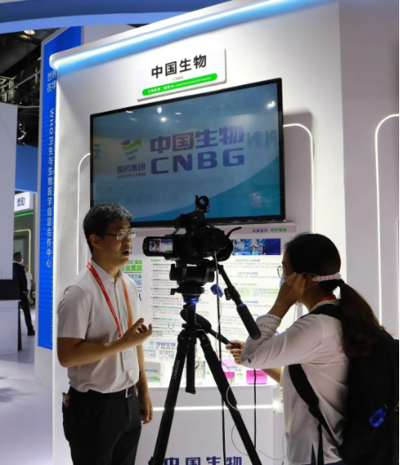 ▲国药集团中国生物副总裁杨汇川在展台现场接受媒体采访
