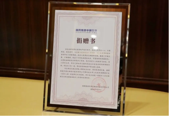 在9月24日召开的第十三届中国生物产业大会上,国药集团中国生物宣布向武汉市人民政府捐赠20万支(10万人份)新冠肺炎灭活疫苗,用于武汉抗疫一线医护人员及驰援武汉的全国各地医护工作者的自身防护,支持武汉疫后重振,保障武汉社会、经济高质量发展。