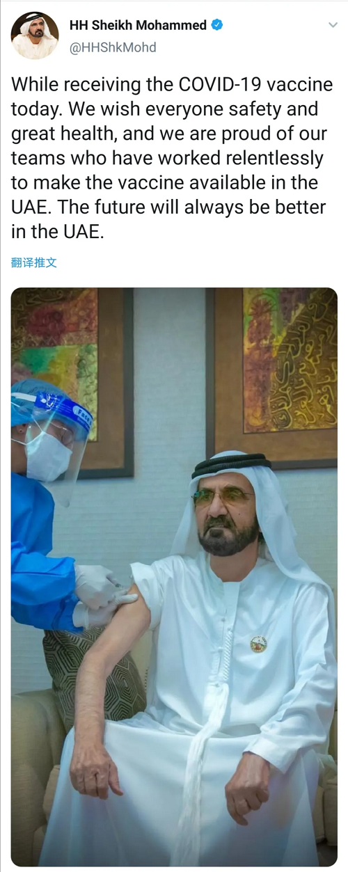 11月3日,阿拉伯联合酋长国副总统兼总理、迪拜酋长阿勒马克图姆在社交媒体分享了自己正在接种国药集团中国生物新冠疫苗的照片,并表示:“在我接种疫苗时我希望所有人安全、健康。我们非常感谢我们的团队,正是他们没日没夜地工作使得阿联酋得以接种新冠疫苗。阿联酋的未来更美好。”