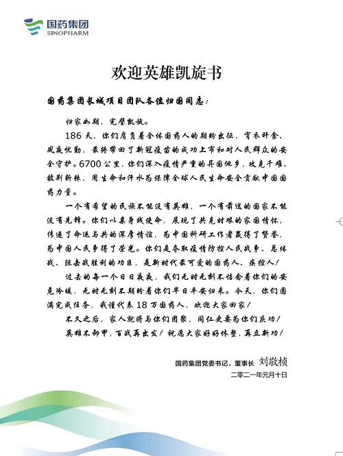 国药集团党委书记、董事长刘敬桢第一时间向凯旋归国的全体人员致信慰问。