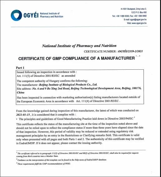 1月13至15日,匈牙利国立药学与营养研究所对国药集团中国生物北京生物制品研究所进行了相关的GMP审计。经过严格审计与综合判定,匈牙利国立药学与营养研究所认为,国药集团中国生物北京生物制品研究所生产的新冠灭活疫苗符合欧盟标准,并允许应急使用。3月3日,国药集团中国生物北京生物制品研究所向匈牙利药监部门提交了相关后续报告。4月1日,按照欧盟监管标准和规则,匈牙利国家药品审批监管机构正式向国药集团中国生物北京生物制品研究所颁发新冠灭活疫苗欧盟通用GMP证书。