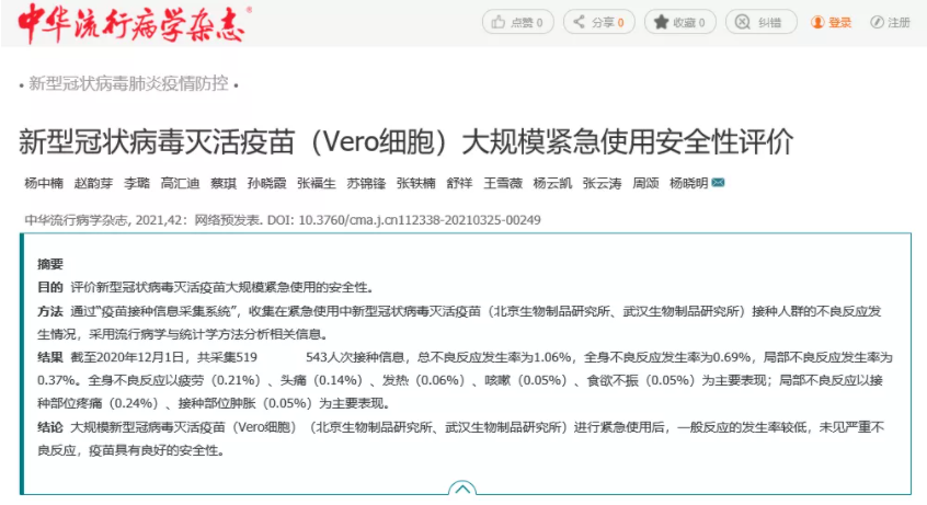 4月21日,中国核心学术期刊《中华流行病学杂志》刊登了题为“新型冠状病毒灭活疫苗(Vero细胞)大规模紧急使用安全性评价”的论文,发布基于国药集团中国生物北京制品研究所、武汉生物制品研究所新型冠状病毒灭活疫苗大规模紧急使用安全性评价。
