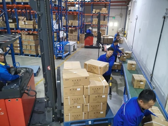 国药控股宁夏物流中心零拣组:零拣区拣货员接续合作,根据拣货标签上载明的信息把不同区域的零货商品拣至零货箱中,将零拣周转箱放置输送线运送至符合包装台,完成零头商品的复合包装。