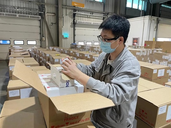 国药保税工作人员,正在对到货药品按照抽验原则进行验收工作。