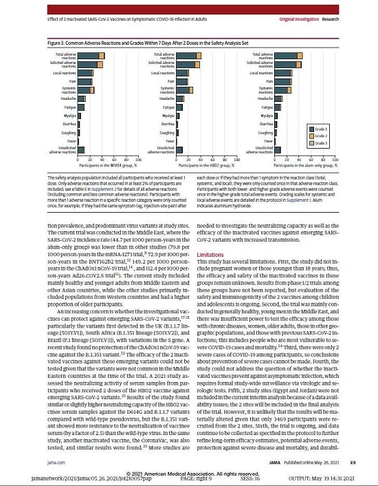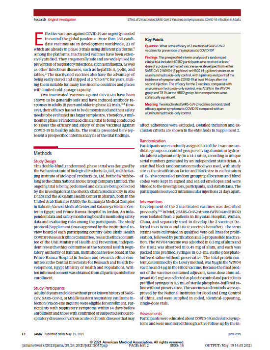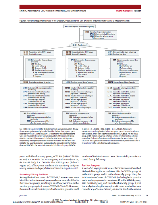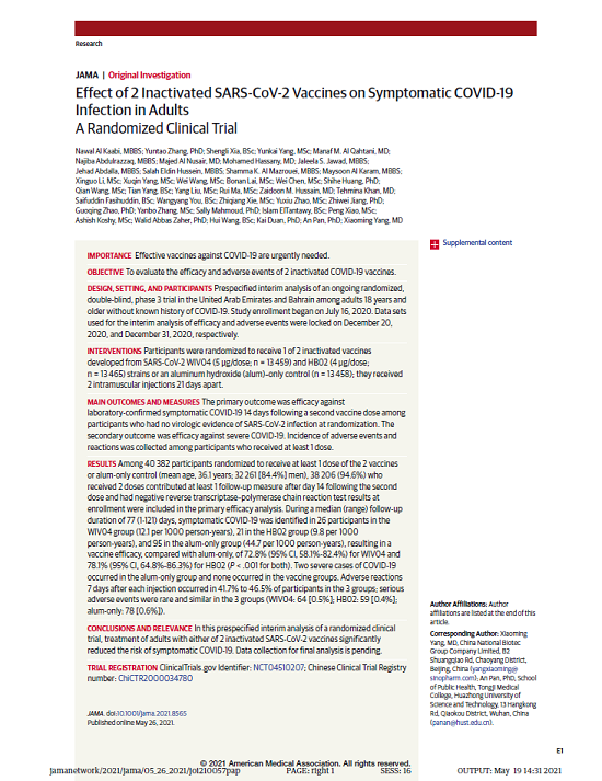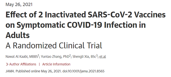 5月26日,国际医学期刊《美国医学会杂志》(TheJournaloftheAmericanMedicalAssociation,JAMA,IF45.54)刊登了国药集团中国生物发表的《两种新型冠状病毒灭活疫苗对成人COVID-19感染的保护效力评价》(“Effectof2InactivatedSARS-CoV-2VaccinesonSymptomaticCOVID-19InfectioninAdults”)。报告依据中国生物新冠灭活疫苗Ⅲ期临床试验结果,总结分析了中国生物所属北京生物制品研究所(BIBP)、武汉生物制品研究所(WIBP)新冠灭活疫苗的有效性、安全性等Ⅲ期临床试验结果。