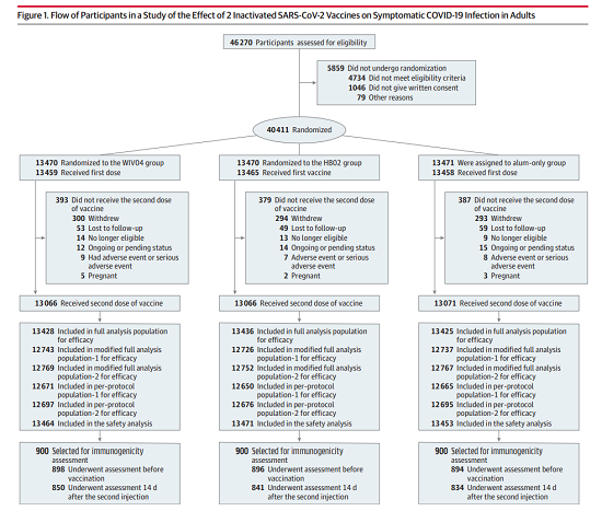 本项目对46270名受试者进行了筛选,其中40411名受试者被随机分至铝佐剂组(13471人),WIV04组(13470人),HB02组(13470人)。最终40382名受试者完成了首次注射:铝佐剂组13458人,WIV04组13459人,HB02组13465人;39223名受试者完成了第二剂注射,每组的受试者分别为13071人、13066人和13086人。