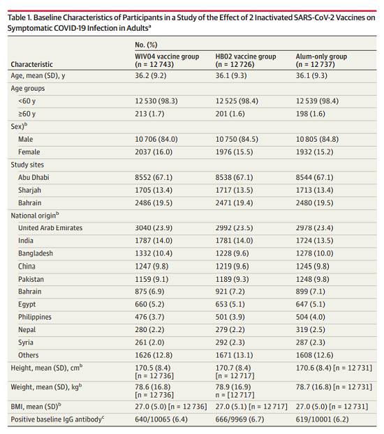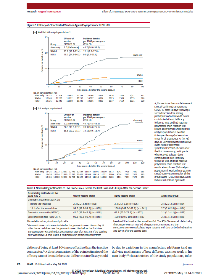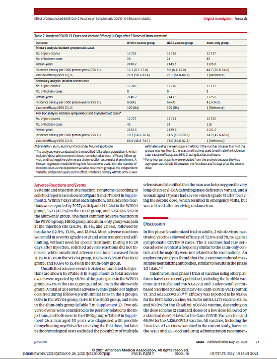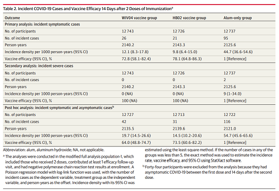 本项研究结果针对中国生物两款新冠灭活疫苗随机、双盲、安慰剂对照的Ⅲ期临床试验开展的中期分析。自2020年7月16日起,40411名受试者入组并随机分为三组,分别为铝佐剂组、新冠疫苗WIV04组和新冠疫苗HB02组。受试者在第0天和第21天接受两次肌肉注射。自第二剂接种后14天,累计确诊142例有效病例(铝佐剂组95例,WIV04组26例,HB02组21例),两种疫苗组有效率分别为72.8%和78.1%(均P<.001)。铝佐剂组出现2例重症病例,两个疫苗组均未出现重症病例。接种后7天总不良反应发生率在铝佐剂组为46.5%,WIV04组为44.2%,HB02组为41.7%。严重不良事件在三组无显著性差异。在两个疫苗组中血清阳转率均高于99.0%(与基线相比中和抗体滴度至少增加4倍),而在铝佐剂组中为2.3%。目前,该研究仍在进行中,长期保护性和安全性仍在评估中。