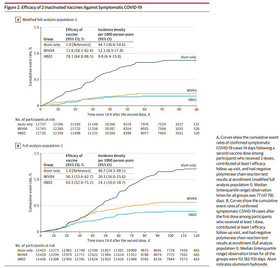 在首针注射35天之内(监测期外),共检定出113例确诊病例:铝佐剂组43例,WIV04组43例,HB02组27例。结果显示,WIV04疫苗接种首针后针对确诊COVID-19病例的保护效力为50.3%(95%CI,33.6%-62.7%),HB02疫苗为65.5%(95%CI,52.0%-75.1%)。第21天(第二次注射日期)之前,铝佐剂组与HB02组、WIV04组之间的发病率相似,第二剂接种后,与铝佐剂组相比,疫苗组发病率显著降低。