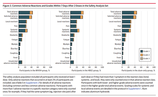 安全性方面,每剂次接种后7天内,WIV04组有5957人(44.2%)、HB02组有5623人(41.7%)、铝佐剂组有6250人(46.5%)报告了不良事件。三组报告的最常见的不良事件是注射部位疼痛(24.3%、19.4%、27.9%),其次是头痛(12.9%、13.1%、12.6%)。大多数不良事件为轻度(1级或2级),具有一过性和自限性,不需要特殊治疗。接种后8-28天,非征集不良事件发生率WIV04组、HB02组和铝佐剂组分别为16.1%、15.5%和15.4%。