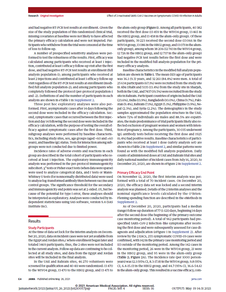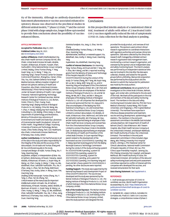 报告由国药集团中国生物、国家联合疫苗工程技术研究中心、武汉生物制品研究所、北京生物制品研究所、阿联酋阿布扎比卫生服务公司(SEHA)谢赫·哈利法医疗城、巴林王国军事医院、阿联酋卫生和预防部、约旦安曼哈姆扎王子医院、埃及卫生部、河南省疾病预防控制中心、北京科特统计咨询有限公司、华中科技大学、G42等多家机构和单位合作完成。报告于2021年3月17日提交至《JAMA》进行编审。