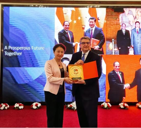 5月31日,国药集团副总经理石晟怡在中国埃及建交65周年庆祝活动上代表国药集团接受埃及驻华大使巴德里颁发的共同抗疫纪念牌。