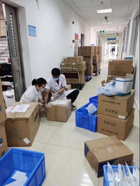 国控广东物流全体员工坚守岗位,克服连日的暴雨,衣服湿了干,干了湿,每日加班加点核算、搬运、分拣、转运配送,随时随地做好准备,确保医院、药店等发出需求的第一时间快速响应。
