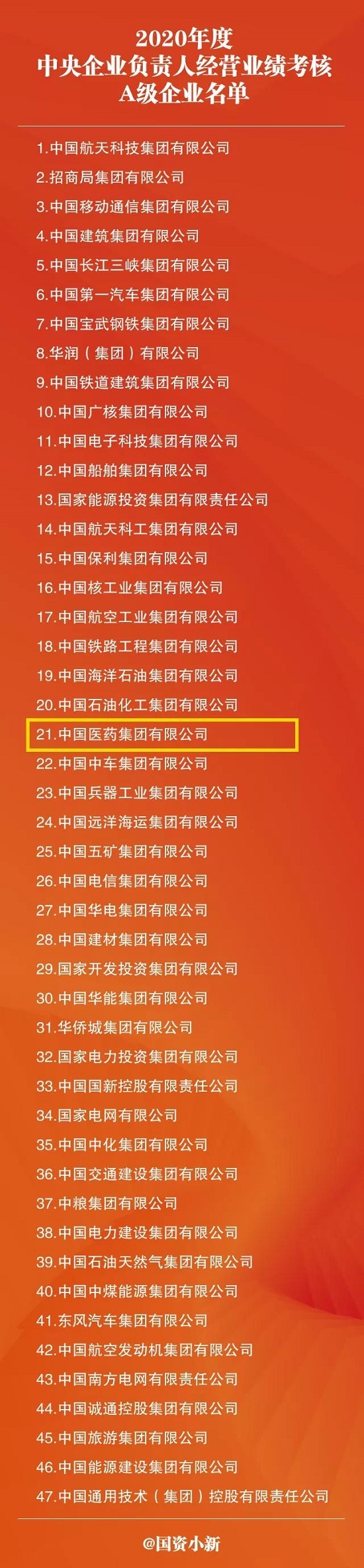 7月13日,国资委发布2020年度中央企业负责人经营业绩考核结果,国药集团连续7年进入中央企业负责人经营业绩考核A级企业名单。