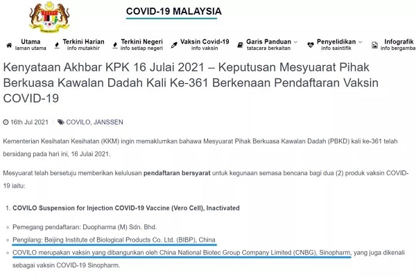 7月16日,马来西亚卫生部总监努尔·希沙姆宣布,马来西亚药品监管部门批准国药集团中国生物新冠疫苗附条件注册上市。