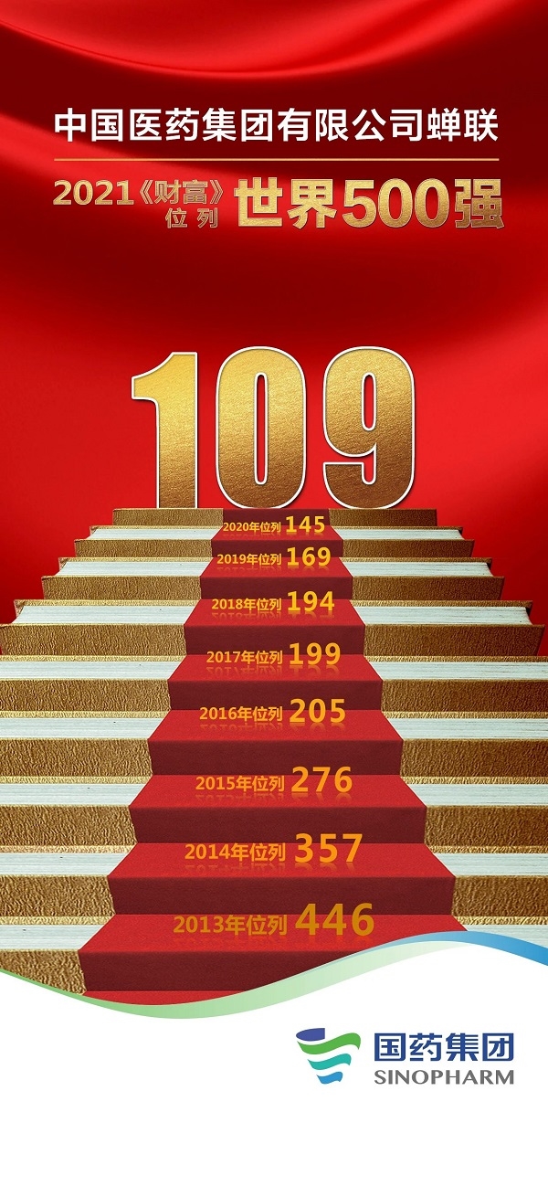 2021年8月2日,《财富》中文网发布了2021年“世界500强”榜单,中国医药集团有限公司(以下简称“国药集团”)位列第109位,较上年提升36位。