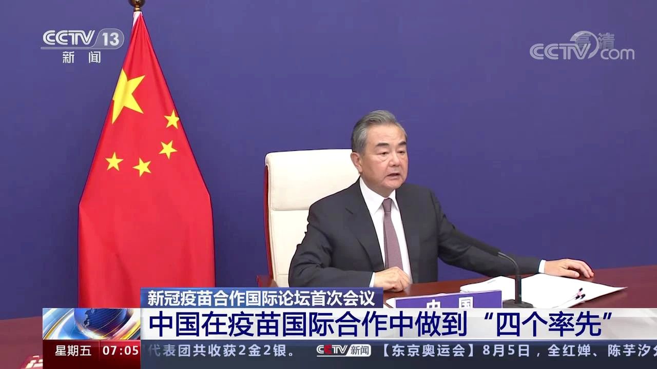 8月5日晚,新冠疫苗合作国际论坛首次会议以视频方式举行。中国国家主席习近平向会议发表书面致辞。中国国务委员兼外长王毅主持会议。有关国家外长、主管部长、联合国等国际组织代表及相关企业代表围绕“加强疫苗国际合作,推进全球疫苗公平合理分配”主题进行深入研讨。会议达成五点共识,23个与会国家还共同发表了新冠疫苗合作国际论坛联合声明。
