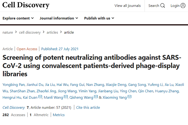 该研究利用噬菌体展示技术,以8名SARS-CoV-2感染康复患者外周血单个核细胞(PBMC)为基因原材料,建立免疫文库,成功筛选出多株对SARS-CoV-2具有高中和活性的单克隆抗体。晶体结构解析数据显示,活性最强的抗体2B11所识别的RBD表位与ACE2的结合位点高度重叠,可有效阻断新冠病毒与细胞表面的ACE-2结合,进而阻止其感染细胞。