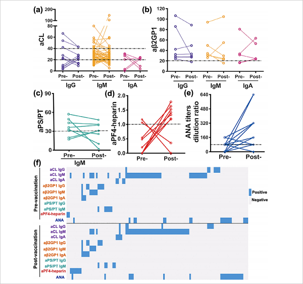 结果显示:第1剂新冠灭活疫苗接种前,入组者新冠抗体阳性率为0,第二剂疫苗接种4周后,新冠抗体血清转化率为95.81% (389/406)。自身抗体的阳性率及抗体水平在接种前后采集的样本中没有显著差异。在最少8周的随访期内,所有入组者均未出现血栓事件及血小板减少。因此,新型冠状病毒灭活疫苗未影响抗磷脂抗体和抗PF4-肝素抗体的水平,同时不增加血栓形成的风险。