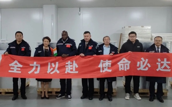 2021年9月19日,国药集团副总经理石晟怡与科特迪瓦驻华大使多索·阿达马共同见证科特迪瓦采购的首批新冠疫苗发运。国药国际副总经理严兵、国药集团中国生物北京生物制品研究所财务总监欧阳俊等陪同参加。