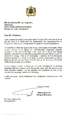 (摩洛哥国王穆罕默德六世致国药集团董事长刘敬桢先生的感谢信)