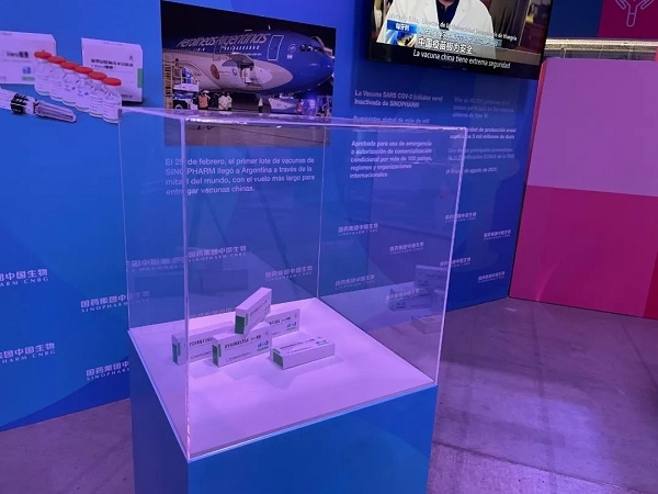 现场设有18平米的线下实体展台,展出国药集团中国生物研制的新冠疫苗产品样品,并借助丰富的影像资料,集中向阿根廷民众科普中国新冠疫苗研发、生产、物流、储存、运输等主要流程。