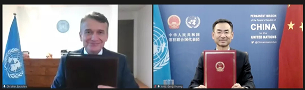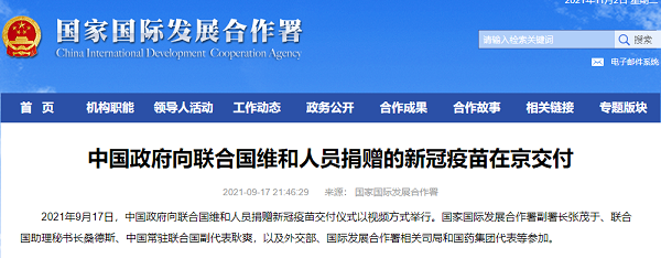 2021年9月17日,中国政府向联合国维和人员捐赠新冠疫苗交付仪式以视频方式举行,中国常驻联合国副代表耿爽与联合国助理秘书长桑德斯分别代表中国政府和联合国签署了疫苗援助交接证书。国药集团代表全程参加捐赠仪式,同日,用于此次捐赠的30万剂国药新冠疫苗在北京出库启运。