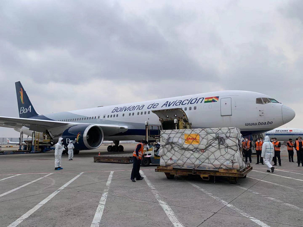 2021年2月24日,运载由国药集团生产的新冠疫苗专机抵达玻利维亚第一大经济城市圣克鲁斯,玻利维亚总统阿尔塞、外长马伊塔等官员,前往机场迎接。尽管相隔万水千山,但两国通力合作、密切配合,从签署疫苗合作协议到疫苗正式运抵相隔不到两周。玻利维亚也是国药疫苗运达的平均海拔最高的国家。