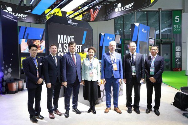 在傲力普(OLIMP)展台,石晟怡与波兰驻上海总领事Marek Ciesielczuk、副总领事Piotr Leszczynski一道参观。Marek Ciesielczuk表示,能与国药集团合作,大大增强傲力普在华发展信心,希望通过此次合作为更多波兰品牌进入中国市场打下良好基础。石晟怡表示,这是国药集团首次和波兰企业开展品牌合作,也是首次从事运动营养产品经营。她相信通过双方努力,能为中国运动爱好者带来更多高质量产品。
