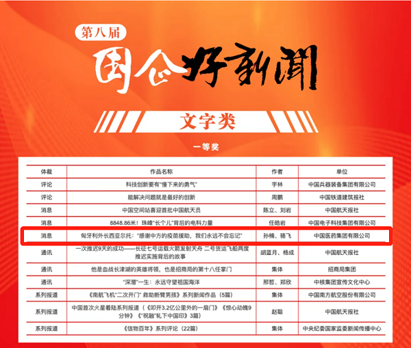 由国药集团报送的《匈牙利外长西亚尔托:“感谢中方的疫苗援助,我们永远不会忘记”》荣膺第八届“国企好新闻”文字类一等奖。