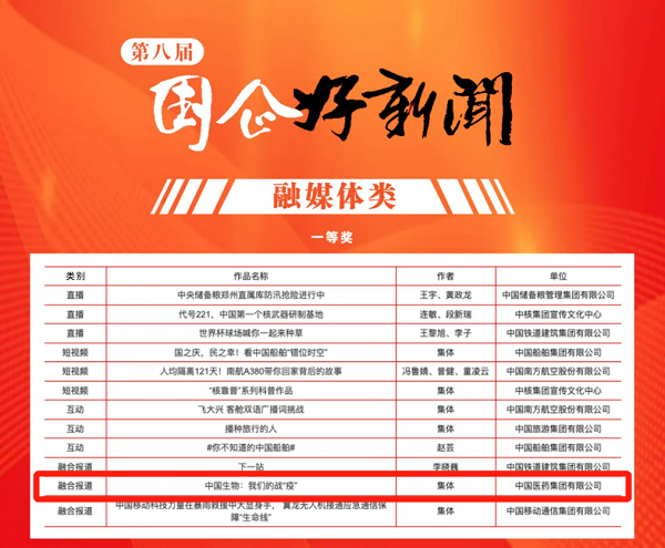 由国药集团报送的《中国生物:我们的战“疫”》荣膺第八届“国企好新闻”融媒体类一等奖。